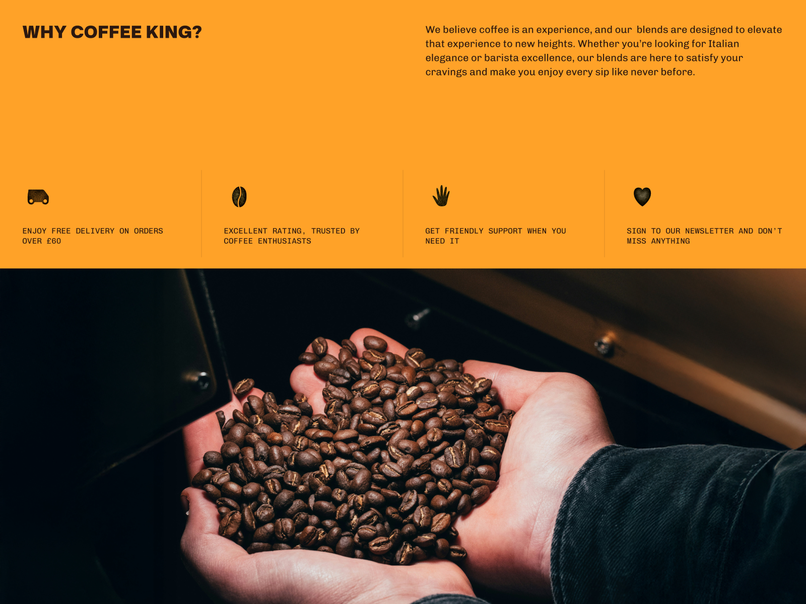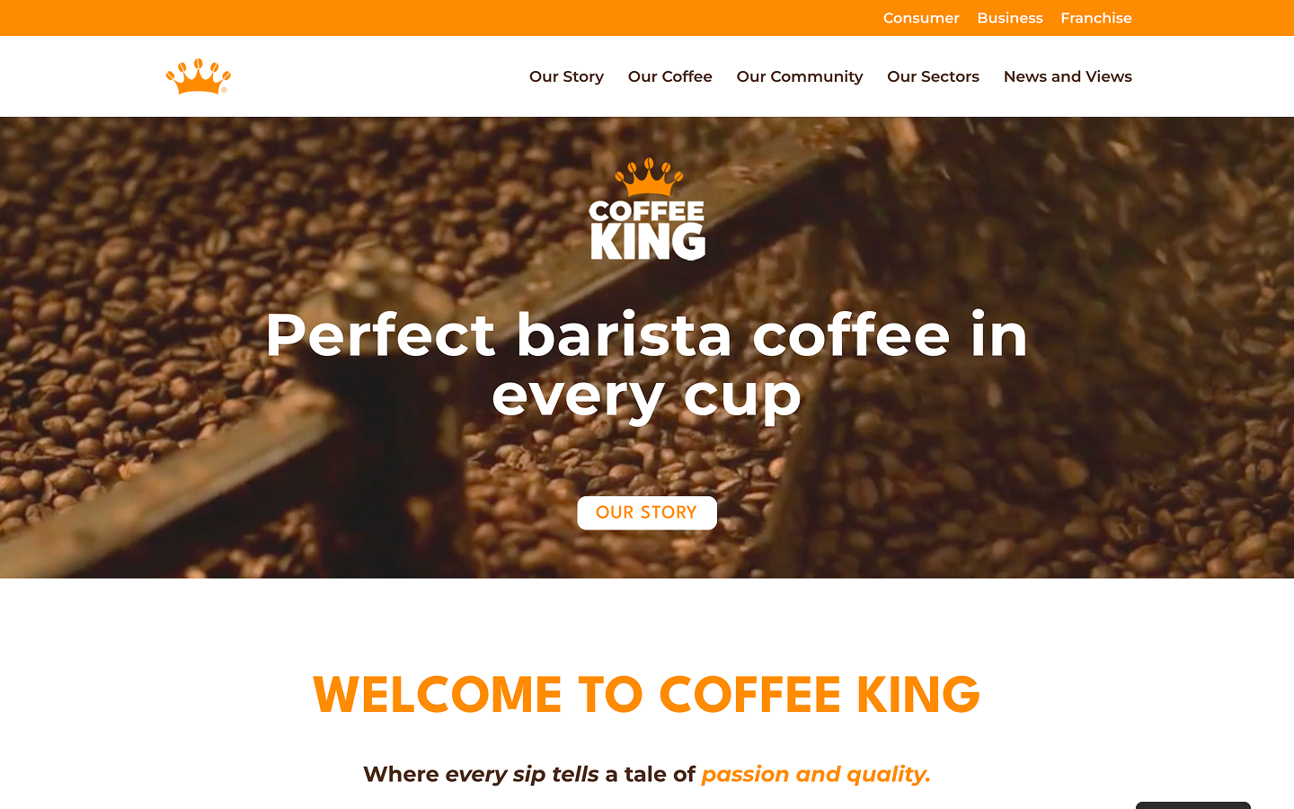 The brief came with a constraint: the existing identity couldn't change. So rather than starting from scratch, we worked with what was there, the crown, the warm browns and oranges, the spirit of the brand, and built a visual system around it. We introduced a complementary colour palette, refined the typography, and created a set of custom icons and illustrations that gave Coffee King a personality it could carry across every page. The result feels warmer, more confident, and unmistakably theirs.