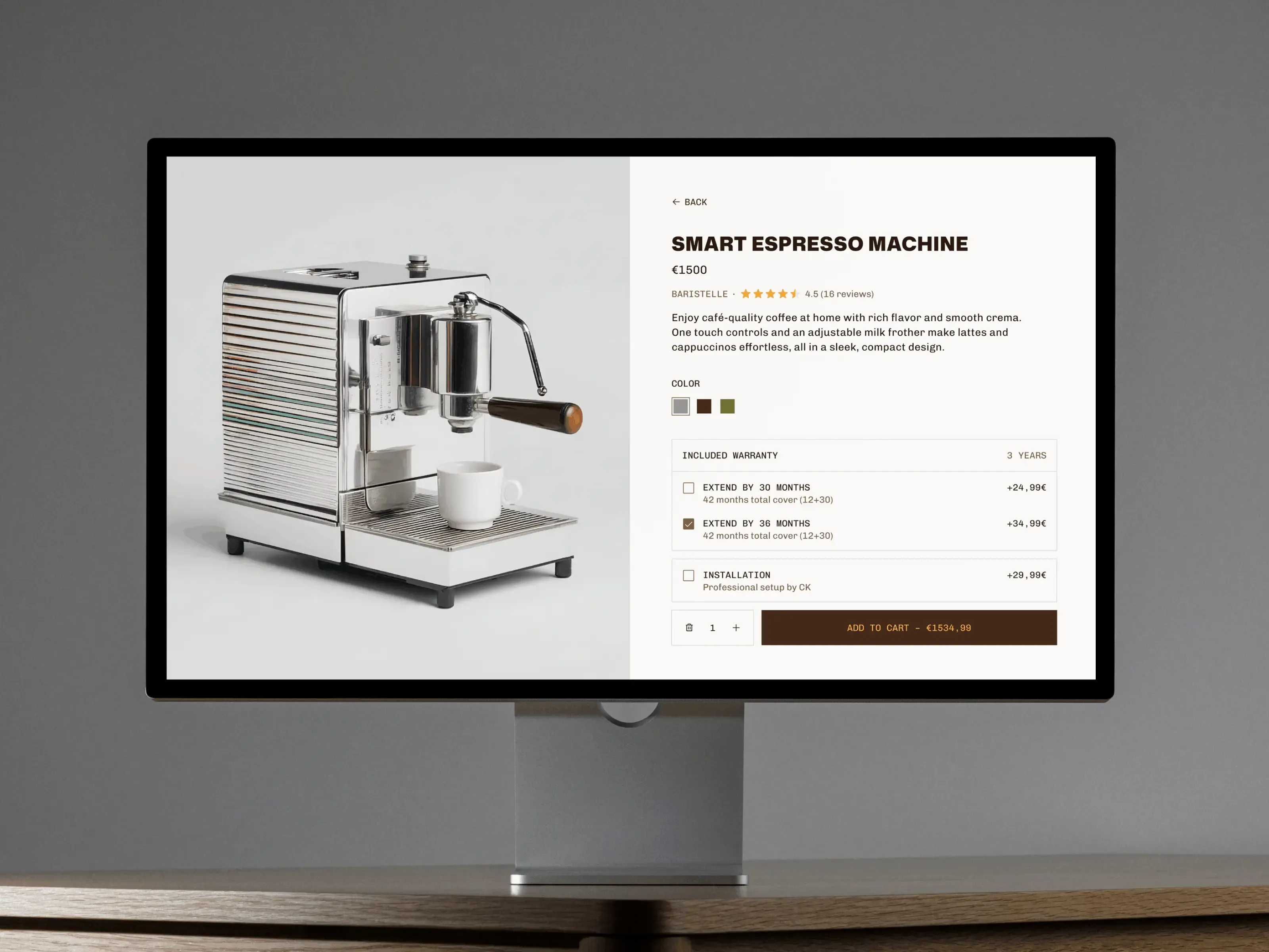 For higher-value products like espresso machines, we designed an add-on system directly within the product page. Users can extend their warranty or add professional installation before adding to cart, with the total updating in real time. A simple interaction that increases average order value without feeling pushy.